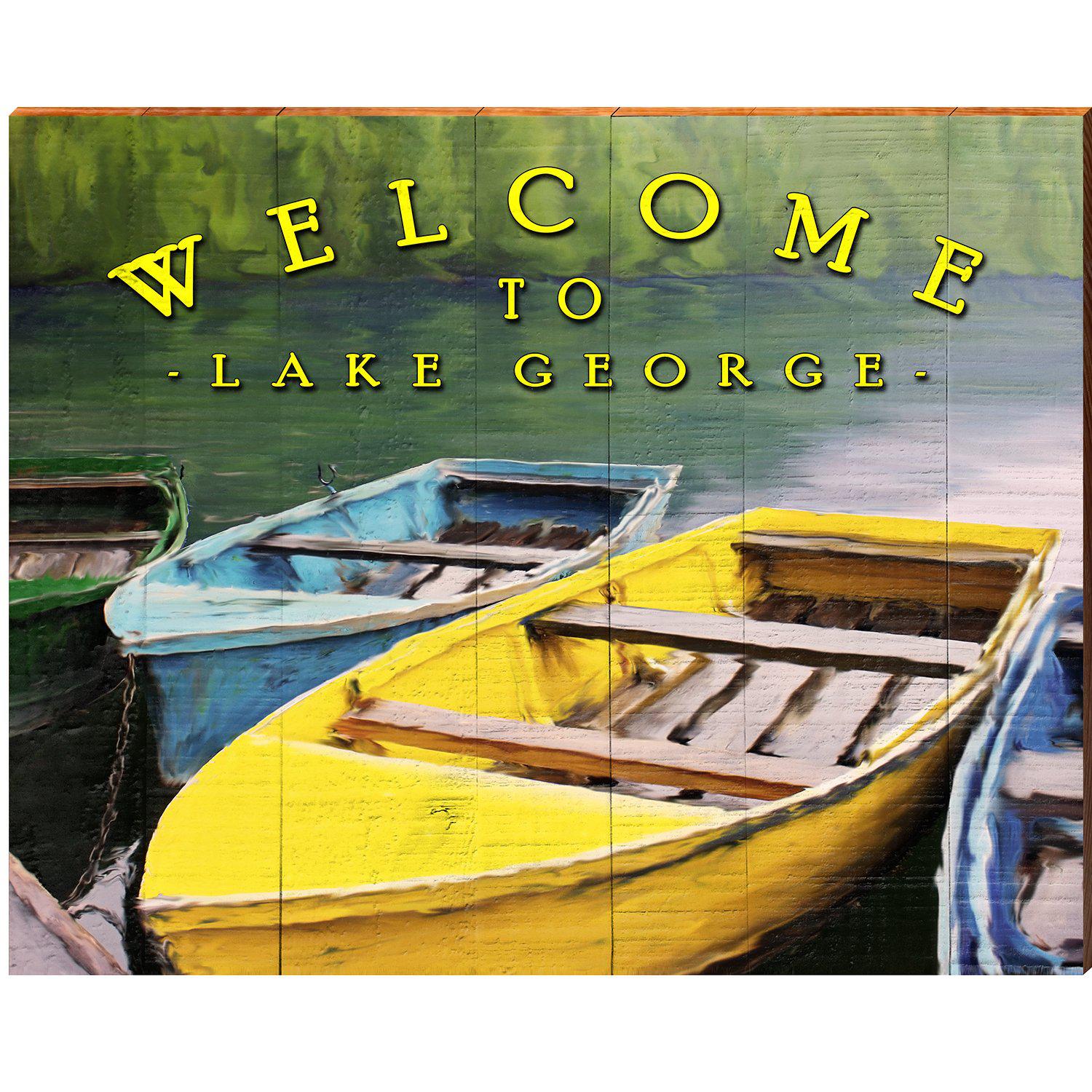 Welcome to Lake George Colorful Boats | Wall Art Print on Real Wood