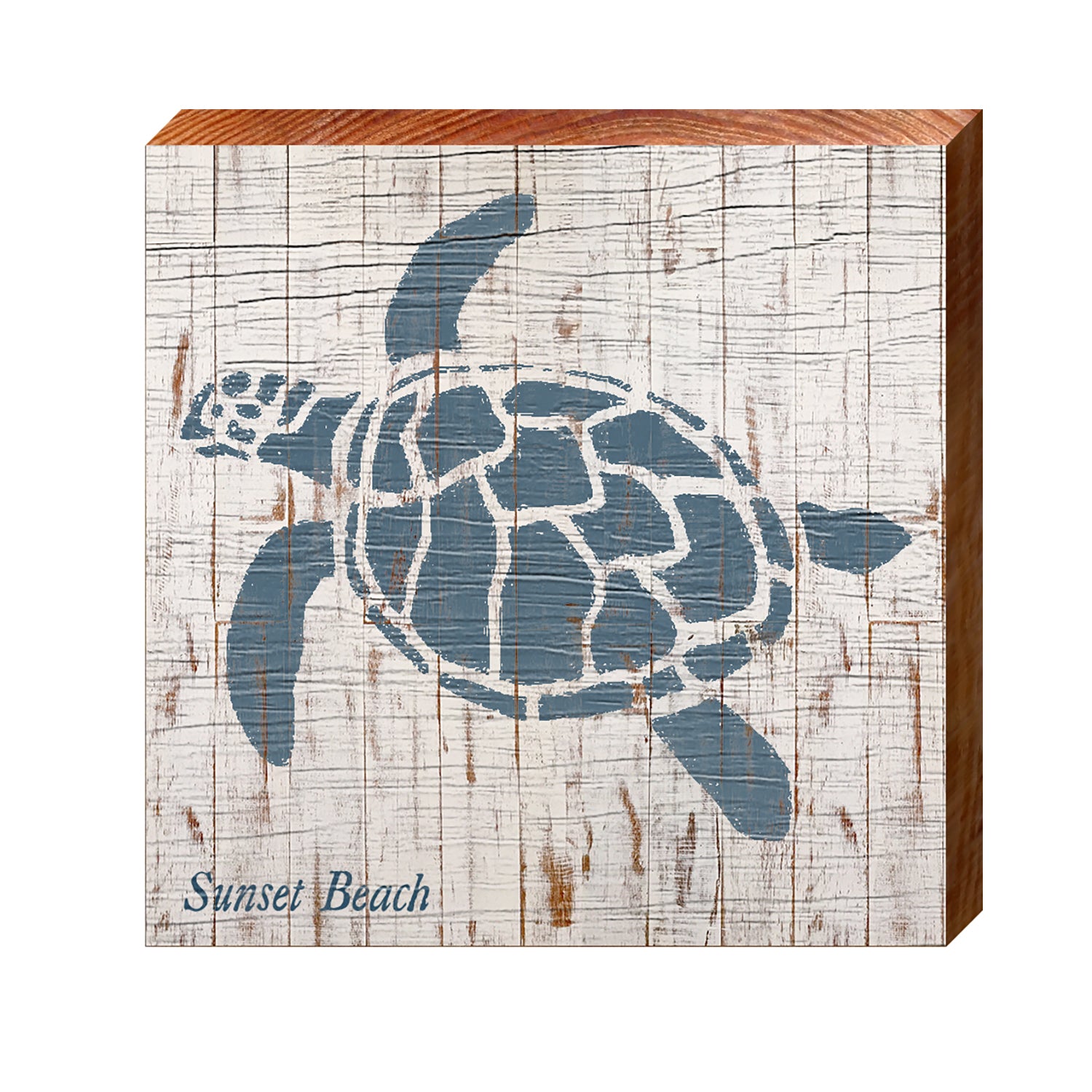 Sunset Beach Sea Turtle Navy White Shabby | Real Wood Art Print